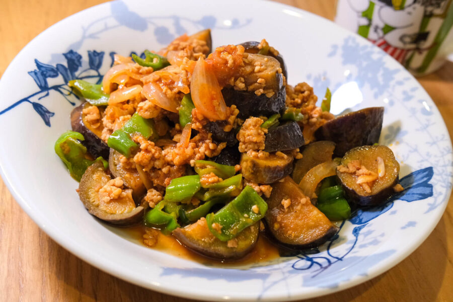 茄子とひき肉、ピーマンを炒め、トマトペーストを加えてさっと煮ました。おかずにもしても、丼めしにしてもおいしい!