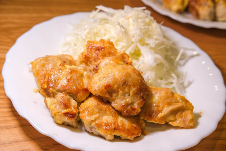 - 薄力粉をまぶした鶏肉を卵液にくぐらせて、フライパンで揚げ焼きにする。