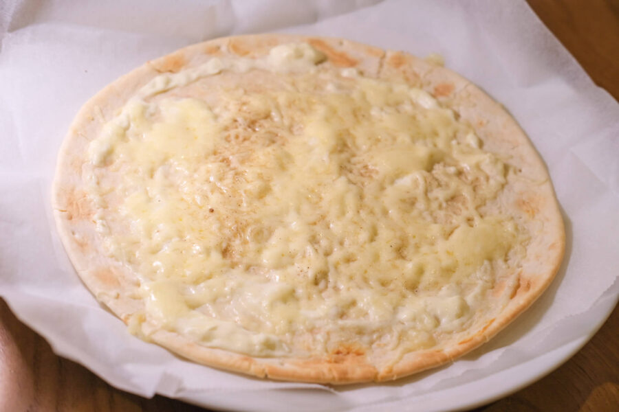 1. ピザクラストの上に練ったクリームチーズを塗り、この上にシュレッドチーズをトッピングし、塩コショウをふりかける。