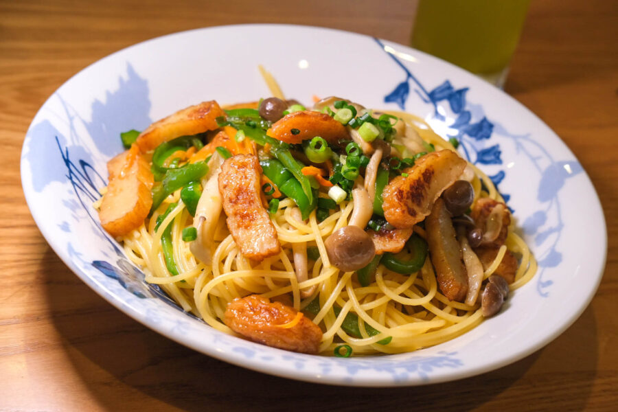 炒めたさつま揚げとピーマンなどの野菜にパスタを合わせました。常備しやすい具材を使った和風の味付けのパスタです。