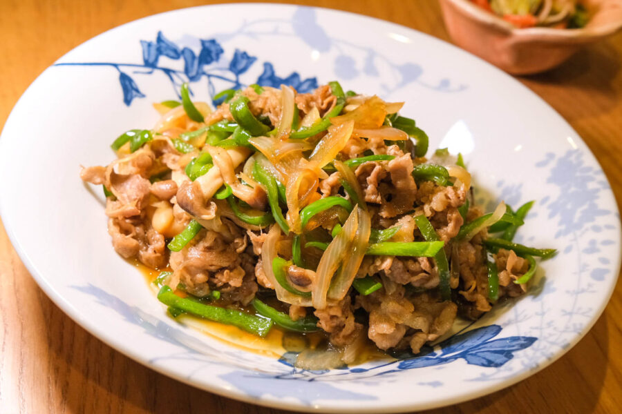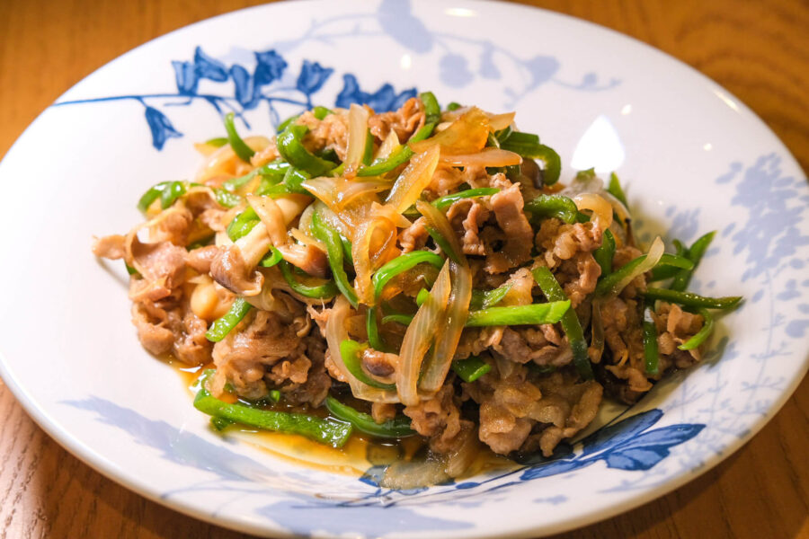 牛薄切り肉をピーマンと玉ねぎと一緒に炒め、醤油&みりんベースのたれで味付け。程良い甘みのあるたれでご飯にぴったり。