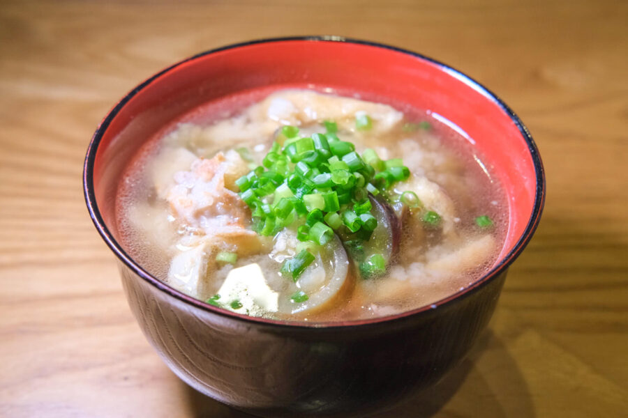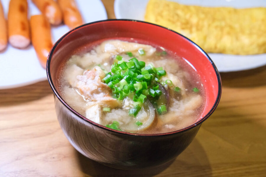 油揚げと茄子を炒めて豚汁にしました。しっかり味の浸みた茄子がうまい!しっかりお腹にたまるのでおかずにもなります。
